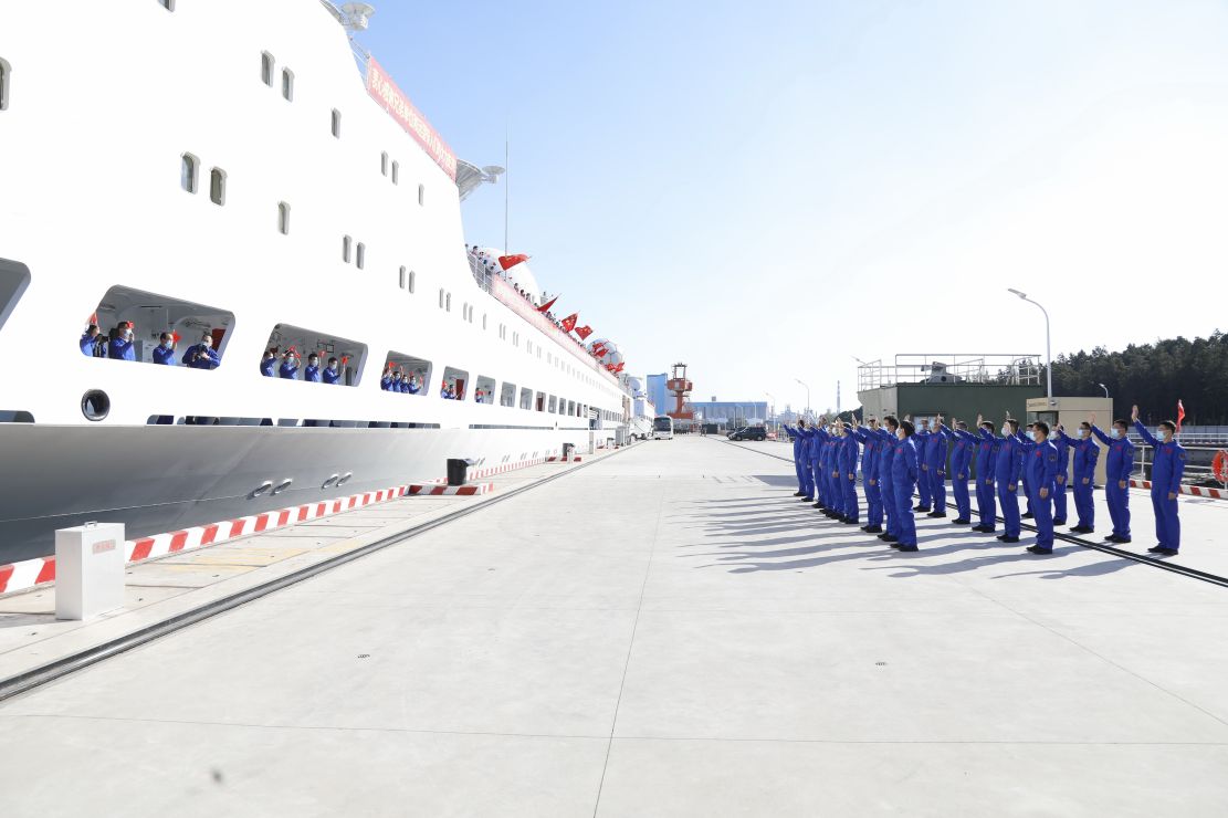 碼頭上,雄壯的汽笛聲環繞,送船人員與船員共同揮舞黨旗、國旗,紅火一片。遠望7號船再次奔向星辰大海,創造全新偉業。