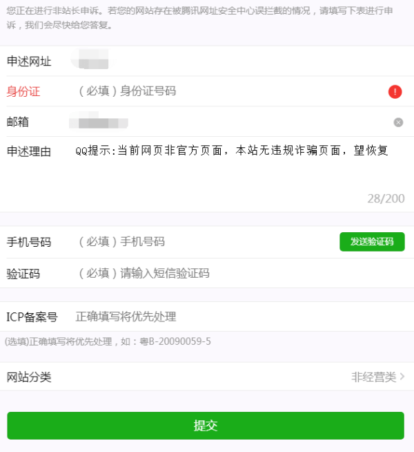填寫好網(wǎng)址,身份證郵箱,手機(jī)驗(yàn)證,備案號(hào),選擇非經(jīng)營(yíng)類。提交申述。