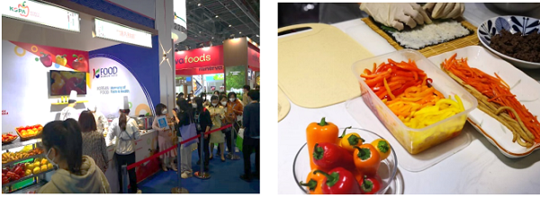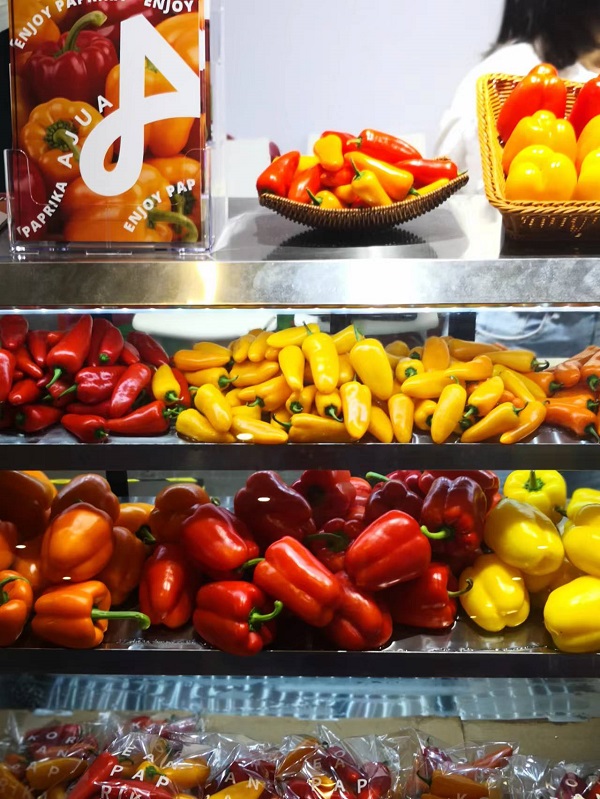 不僅如此,韓國館還準備了韓國彩椒特色宣傳館,風靡中韓的韓國彩椒Paprika以“可即食,如同水果”的清爽微甜的口感,以及優于其他果蔬維生素C的含量,成為名副其實的“健康果”。展會現場每天準備了由經驗豐富的韓國大廚帶來的特色彩椒食譜,供廣大觀眾體驗品嘗,現場掃碼還可以免費領取一袋彩椒體驗裝,人氣十分火爆。